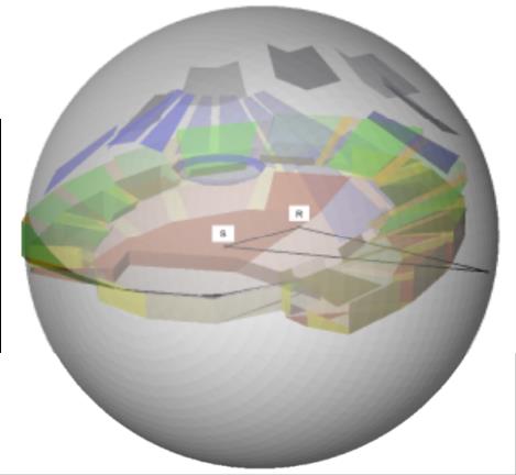 18도의 역부채꼴 벽은 전형적으로 3차반사와 함께 충분한 측면사운드를 제공하고, 이런 측면 반사들은 보통 첫-번째 도착하는 반사들이 아니다. IMAGES는 실제 룸의 형태를 위한 음선 경로를 그림 19에서 이렇게 표현하고 있다.